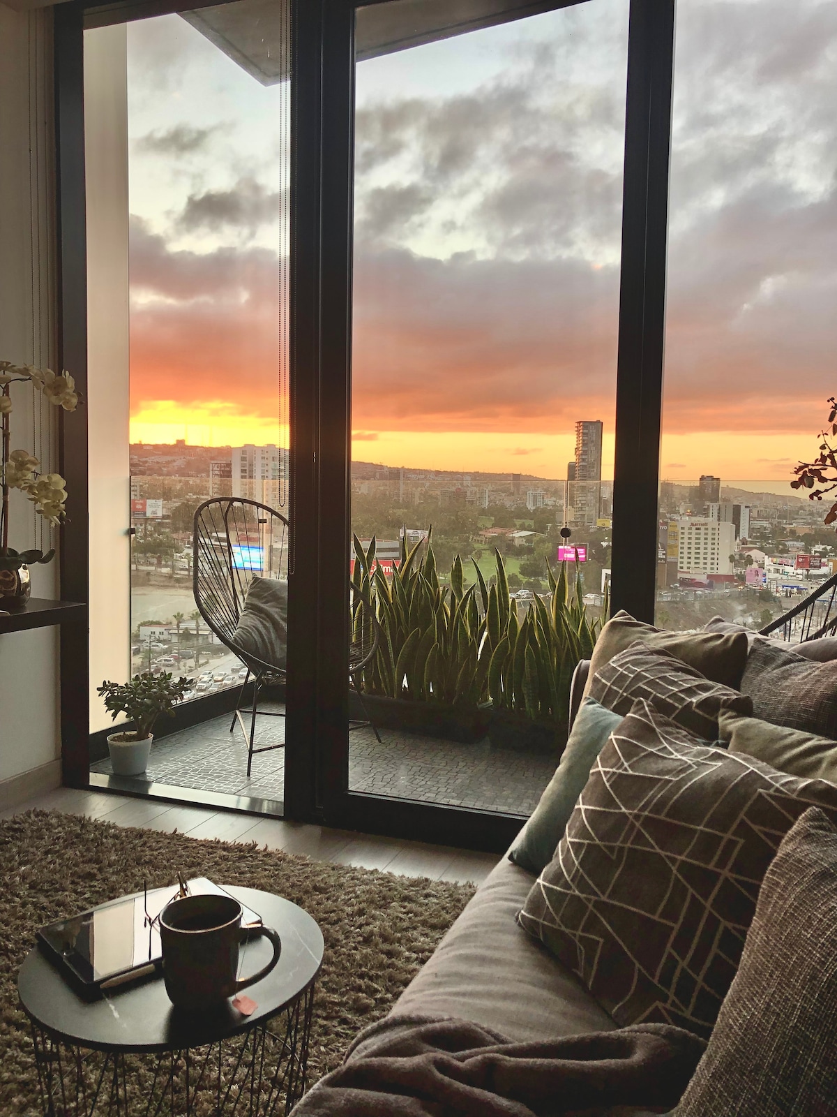 Disfruta de una experiencia con estilo en este alojamiento ubicado a 10 min del cruce internacional en auto, a 10 min de la zona turística caminando. Con vistas al centro de Tijuana. Cercano a cafés y restaurantes de la zona. Cómodo y seguro para caminar, con seguridad interna las 24 horas. El departamento cuenta con dos balcones y excelente iluminación, ventanas de piso a techo con persianas blackout para más control de la iluminación.