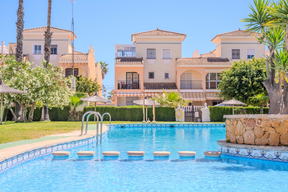 This stunning house has been recently renovated and is fully equipped..Facing East, it enjoys sunshine from early morning! The house is located in a private residential complex where you can park your car right at the doorstep. The complex has two communal swimming pools, one of which is directly opposite! The house is one block from the Saturday market and two blocks from the "La Zenia" shopping center. Amenities include air conditioning, a Smart TV, and free Wi-Fi. Pets are welcome!