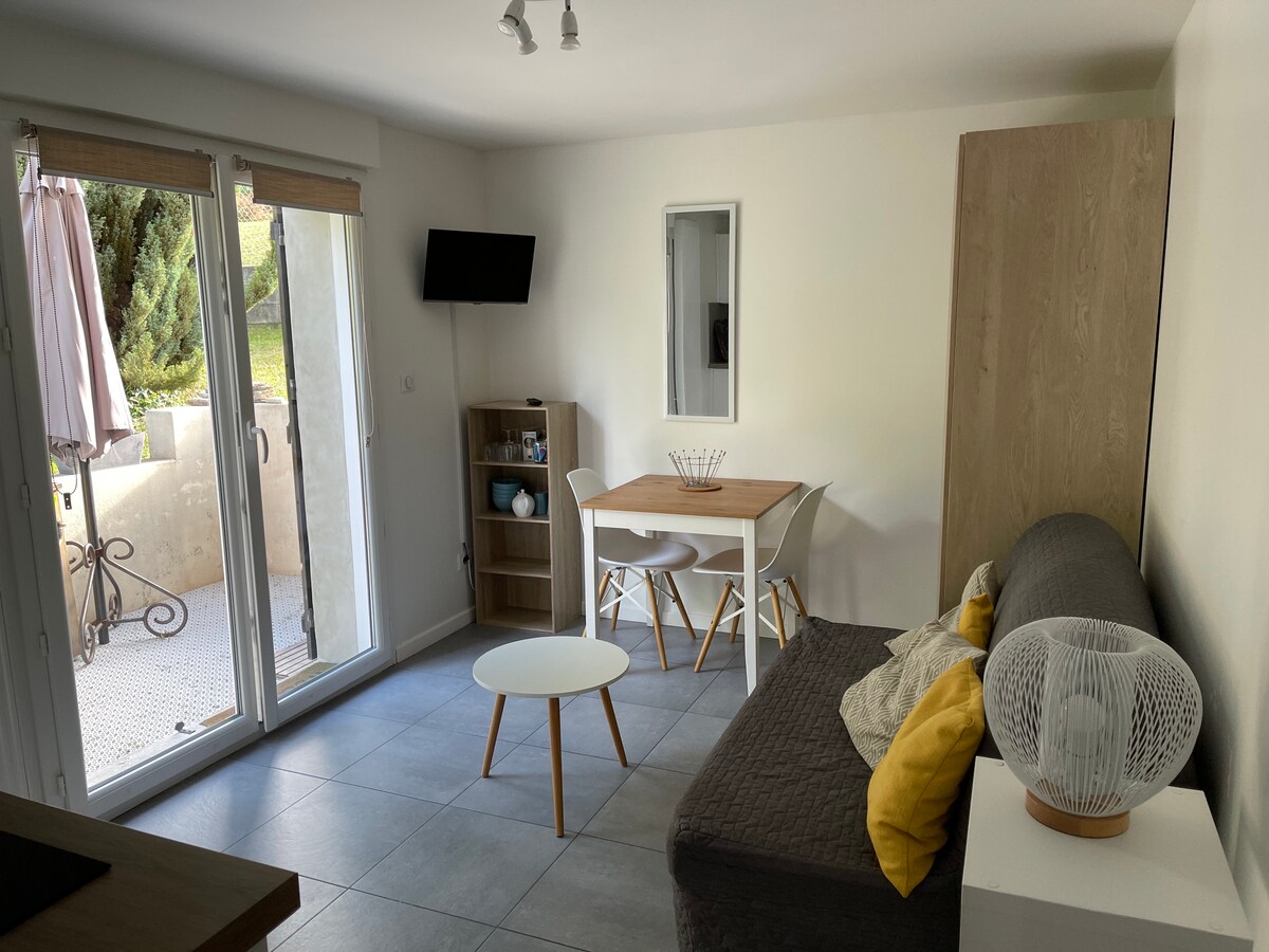 Bonito apartamento de 35 m2 reformado en una residencia con vistas al diente del gato. Situado a 5 minutos andando de la estación de tren de Aix les bains y muy cerca del centro de la ciudad. El encanto de este alojamiento chalet le seducirá seguro. En este alojamiento se beneficia de una sauna privada, una hermosa cocina equipada, una cama de 160, una televisión con pequeña zona de estar. De un magnífico cuarto de baño con ducha.