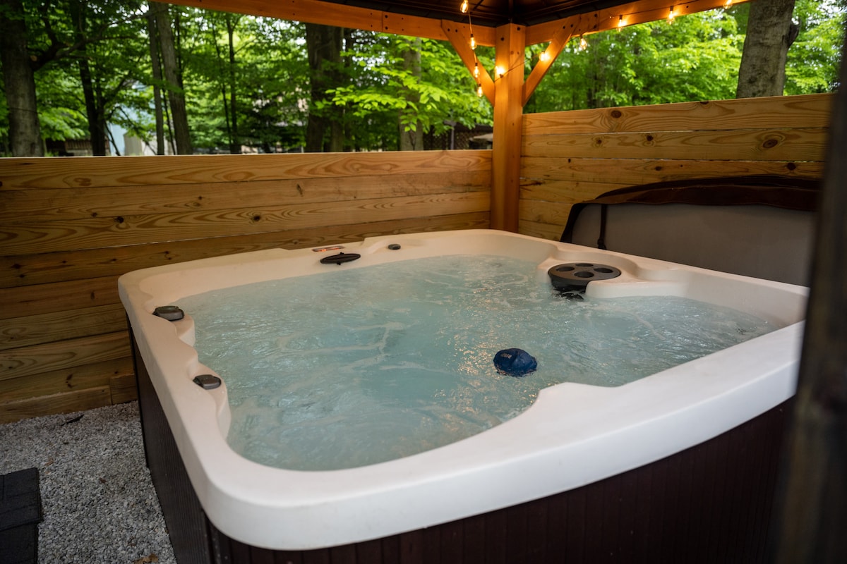 Diversión en las montañas Pocono. ¡La propiedad es hermosa y acogedora con una bañera de hidromasaje durante todo el año lista para que te subas y te RELAJES! Cocina totalmente equipada, se proporcionan sábanas limpias para las cómodas camas tamaño queen. Senderismo, vehículos todoterreno, paseos a caballo, centro de aventuras Skytop a 3 minutos de tirolina, escalada en las copas de los árboles, paintball y «arrow tag». Comida y bebida excelentes en varios restaurantes muy locales. También cerca del casino, Camelback y Kalahari. Descuentos para estancias de varias noches Wifi rápido y espacio de trabajo «convertible»