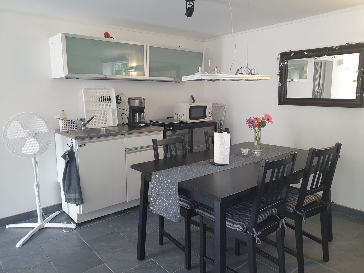Un apartamento fresco en el sótano de nuestra casa con entrada independiente y con todas las instalaciones. Aseo/ducha privados. Ten en cuenta que si reservas para 5 personas, la 5.ª persona dormirá en un colchón de suelo separado. Es posible cargar el coche con un cargo adicional. Cooperativa y parada de autobús frente a la casa, no se admiten mascotas, no se permite fumar. Baño al otro lado de la sala de cine y al otro lado del pasillo. Se puede cocinar a la ligera. Cinemaroom NO incluido, pero se puede ofrecer con un cargo adicional. Como los gastos de limpieza no están incluidos, deja la habitación limpia.