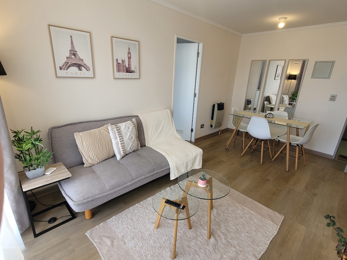 Apartamento completamente amoblado, en tercer piso , que da a avenida principal, dormitorio con una cama matrimonial y con sofá-cama para 1 niño o 1 adulto joven ,wife ,Tv cable ( VTR),estacionamiento privado (gratis previa confirmación), a 5 minutos del centro a pie. A pasos de supermercados, cafés, restaurantes y tiendas de diferentes tipos.Locomoción colectiva a la puerta. Centro de salud a pocas cuadras. Areas comunes agradables para el confort de vacaciones, viajes de negocios y/o otros.