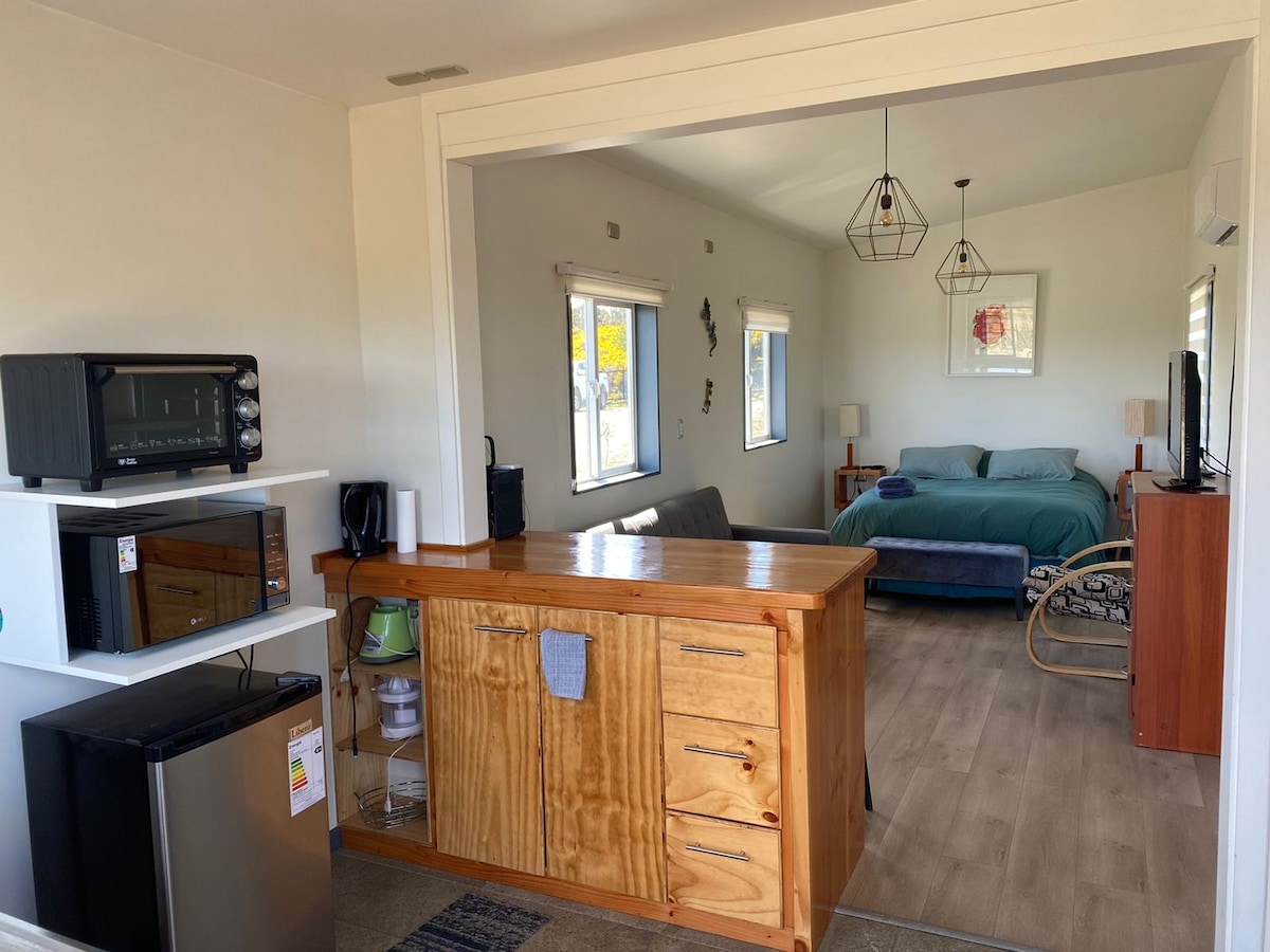 Cabaña de un ambiente con capacidad para una pareja o 1 matrimonio con 2 niños pequeños para ello contamos con un sillón cama. Ubicada en una parcelación privada a minutos del centro de Puerto Varas. Excelente conectividad a Ruta 5 y a solo minutos del Lago Llanquihue y camino al Volcán. Lugar ideal para el descanso y relajo, donde además si necesitas trabajar contamos con todo lo necesario. La cocina cuenta con encimera (4p), frigobar, horno eléctrico y vajilla.