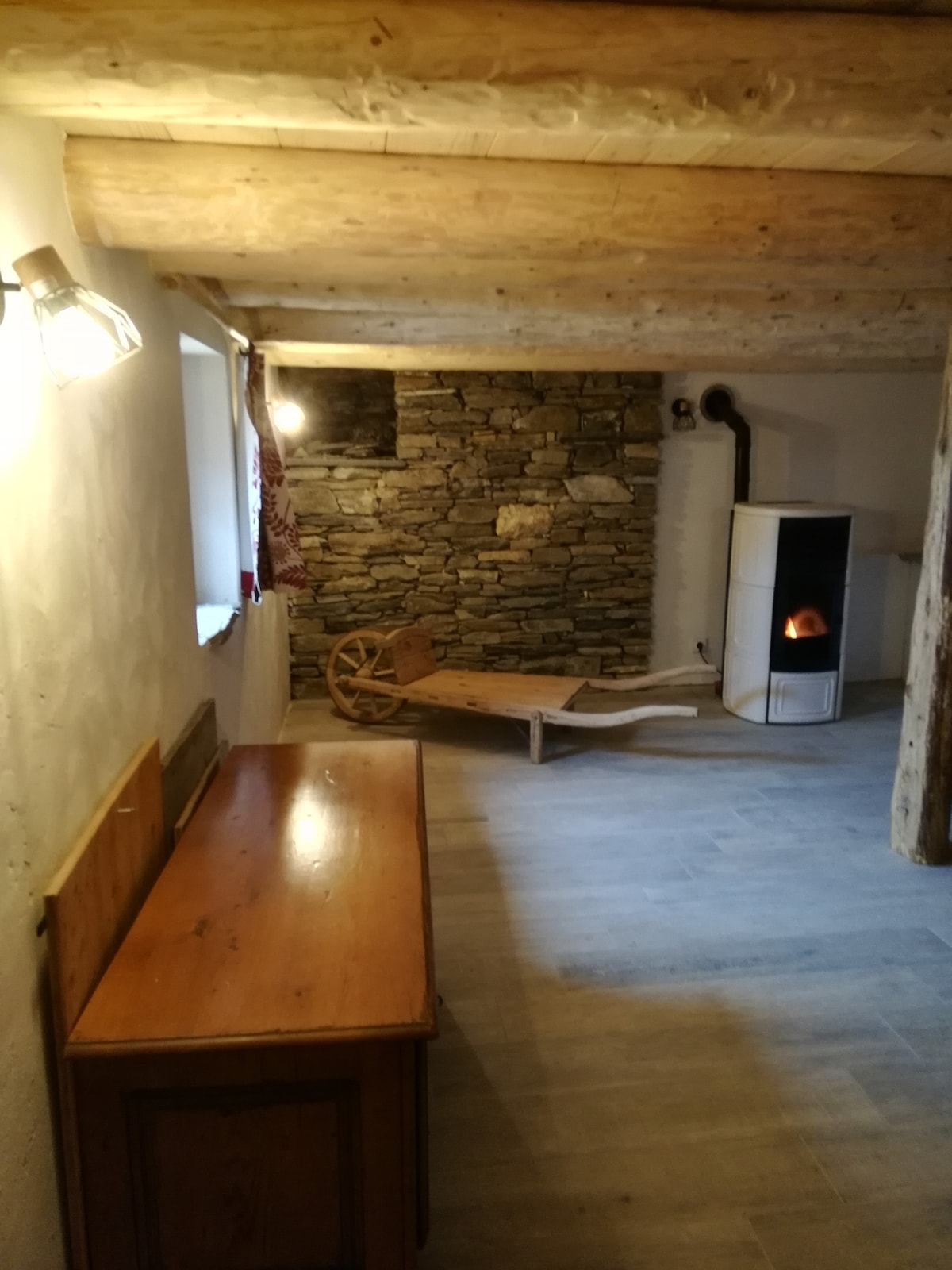 Amplia cabaña panorámica creada en el antiguo granero con vigas y vigas expuestas, en una planta, con entrepiso, balcón y jardín privado. Renovación reciente, 1 dormitorio doble, 1 cama de matrimonio en el entresuelo, sofá cama en el salón. Cocina equipada. Baño con ducha. Estufa de leña con fuego expuesto. Energía solar térmica y fotovoltaica. Busca «Baite del Baus» «Baita della meridiana» «Baita panoramica in borgo alpino» «Panoramicissima baita montana indipendente»