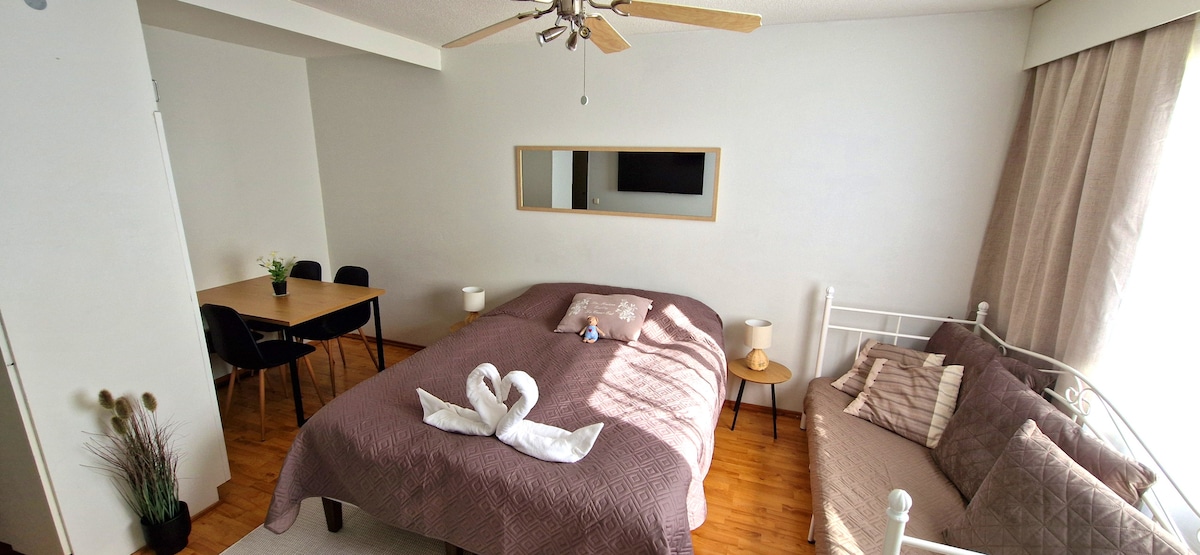 Le damos la bienvenida a un apartamento con un ambiente cálido, que forma parte de un antiguo edificio de madera. La casa está situada en Kaukaa, bajo las chimeneas de la fábrica de papel. El apartamento es pequeño, pero compacto y tiene todo lo necesario. Se puede aparcar el coche en el patio de forma gratuita y el autobús pasa justo al lado. El barrio es agradable y tranquilo. Bienvenido. Estudio cálido y acogedor con dos camas individuales, cocina encantadora y baño con ducha. En una ubicación a poca distancia en coche de la hermosa ciudad y el puerto de Lappeenranta.