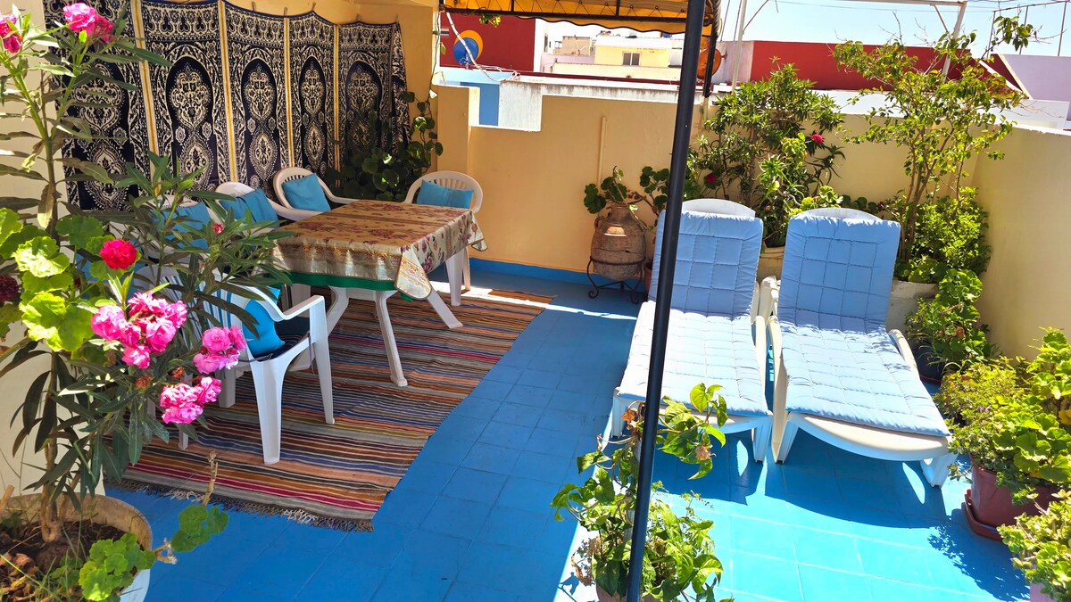 Amplio apartamento luminoso y espacioso, de 150 m2. A 2 minutos a pie de la medina, a 1 minuto de la calle principal, pero con poco tráfico. Enorme salón y comedor con ventanas a tres lados, 2 habitaciones dobles y 1 habitación con dos camas individuales, ducha/lavadero y cocina totalmente equipada con acceso a la terraza de la azotea con zona de pérgola sombreada, perfecta para cenar, hacer barbacoas, tomar el sol y ver las puestas de sol.