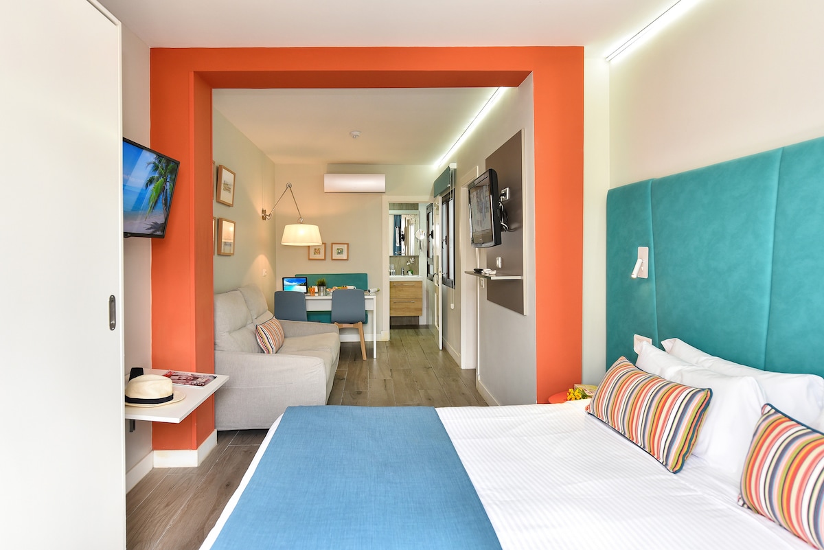 Estudio con balcón privado para hasta 3 personas, luminoso y funcional, con espacio abierto de salón-dormitorio, cocina totalmente equipada y baño privado. Ideal para parejas que desean disfrutar del aire libre y la luz natural durante su estancia en Las Palmas. Incluye limpieza diaria con cambio de toallas y recepción 24 horas, combinando la comodidad de un hotel con la independencia de un apartamento. Dispone de Wi-Fi gratuito y aire acondicionado.