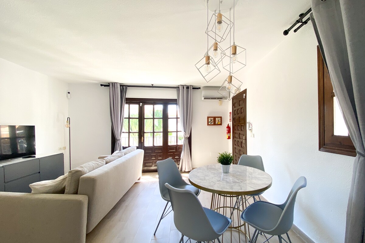 En este luminoso, acogedor y cómodo apartamento te sentirás como en casa. Residencial en primera línea con piscina, parking privado, cercano a todos los servicios pero en tranquila urbanización. Duplex con dos patios exteriores de estilo andaluz ideales para disfrutar de cualquier comida, decoración moderna y actual, con aseo en planta baja y baño junto a dormitorios, conexión WIFI, canales TV, AC.