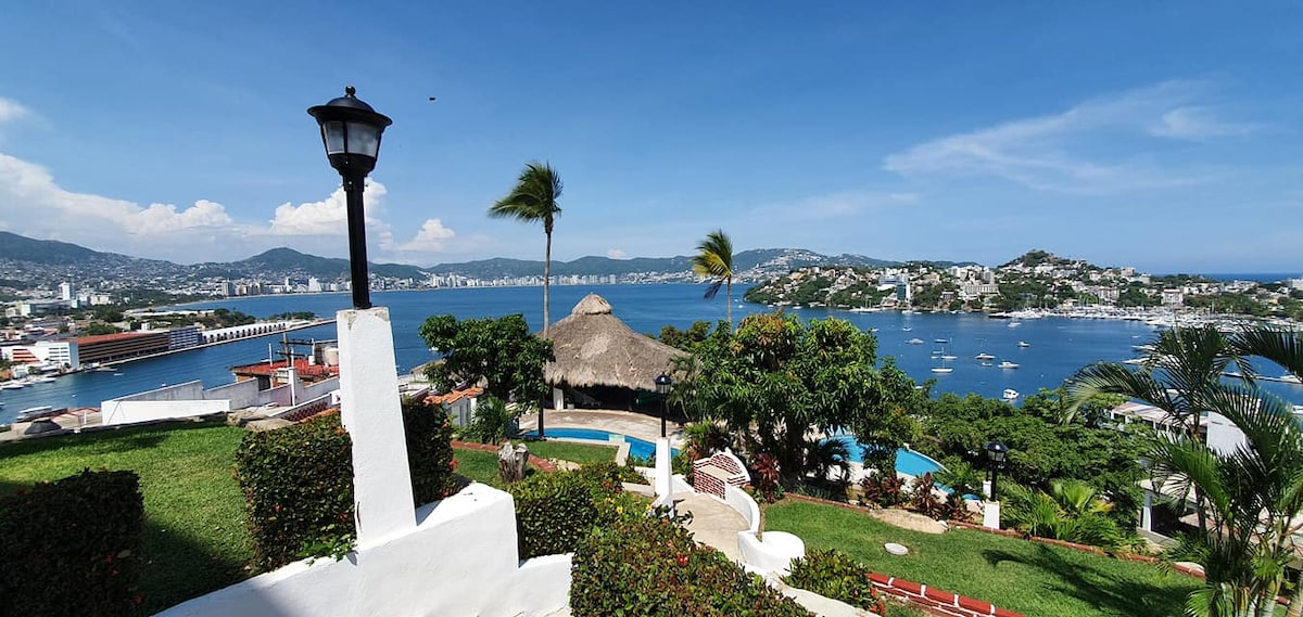 Acogedor departamento, con una vista excelente de la Bahía de Acapulco. Privacidad y sin el ruido para tener unas vacaciones agradables. Dos recamaras, dos baños completos, cocina equipada, aire acondicionado y ventiladores de techo para refrescar todo el departamento. La alberca a unos cuantos pasos de ti, disfruta de la vista. El depto. está recién remodelado por lo que en su mayoría todo es nuevo listo para que lo uses. Con excelente ubicación para ir a disfrutar de las playas.