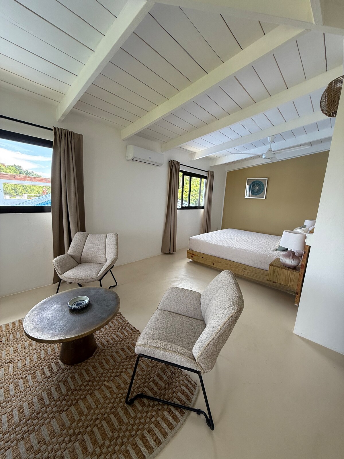 Escápate al paraíso en nuestro espacioso hotel boutique recién renovado. ¡Nuestro hotel ecológico está a unos pasos de la playa en el corazón de Las Terrenas! Despiértate con impresionantes vistas al mar, relájate junto a nuestra lujosa piscina de tres niveles rodeada de palmeras o siente la brisa del mar mientras te relajas bajo el sol. Con serenidad tropical, lujo moderno y la playa a pocos minutos, ¡tu escapada perfecta te espera! La suite incluye una cama king size, baño privado y aire acondicionado.