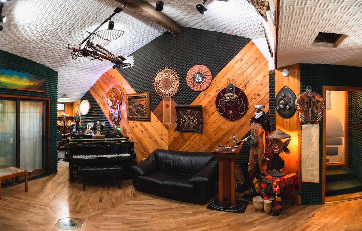 El estudio de grabación es un estudio reconvertido de cuatro habitaciones (no queda equipo) en el campo rodeado de viñedos y bosques. El precio incluye una tarifa fiscal del condado de 10 $ y ningún coste de limpieza u otros extras. Tienes acceso a un enchufe para vehículos eléctricos de nivel 2, medio baño y cocina pequeña, cocina principal compartida y ducha compartida. Espacio libre de alergias, no se admiten mascotas. Nuestro lugar está lleno de arte, paisaje mágico de Alicia en el País de las Maravillas, música, caballos y creatividad. Al final de la carretera hay una reserva de bosque de 56 acres para hacer senderismo.