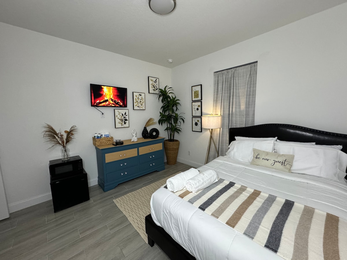 Bienvenido a Sunshine Vibes, un refugio acogedor y elegante en el corazón de Lehigh Acres. Ya sea para el trabajo, una escapada romántica o una escapada relajante, nuestro espacio está diseñado para que te sientas como en casa. Disfrute de una lujosa cama queen, televisor inteligente, una cocina moderna para preparar sus comidas. Un espacio de trabajo remoto. La decoración de temporada y la luz natural crean un ambiente cálido y acogedor, ideal para cualquier estancia. ¡Reserva tu escapada hoy!
