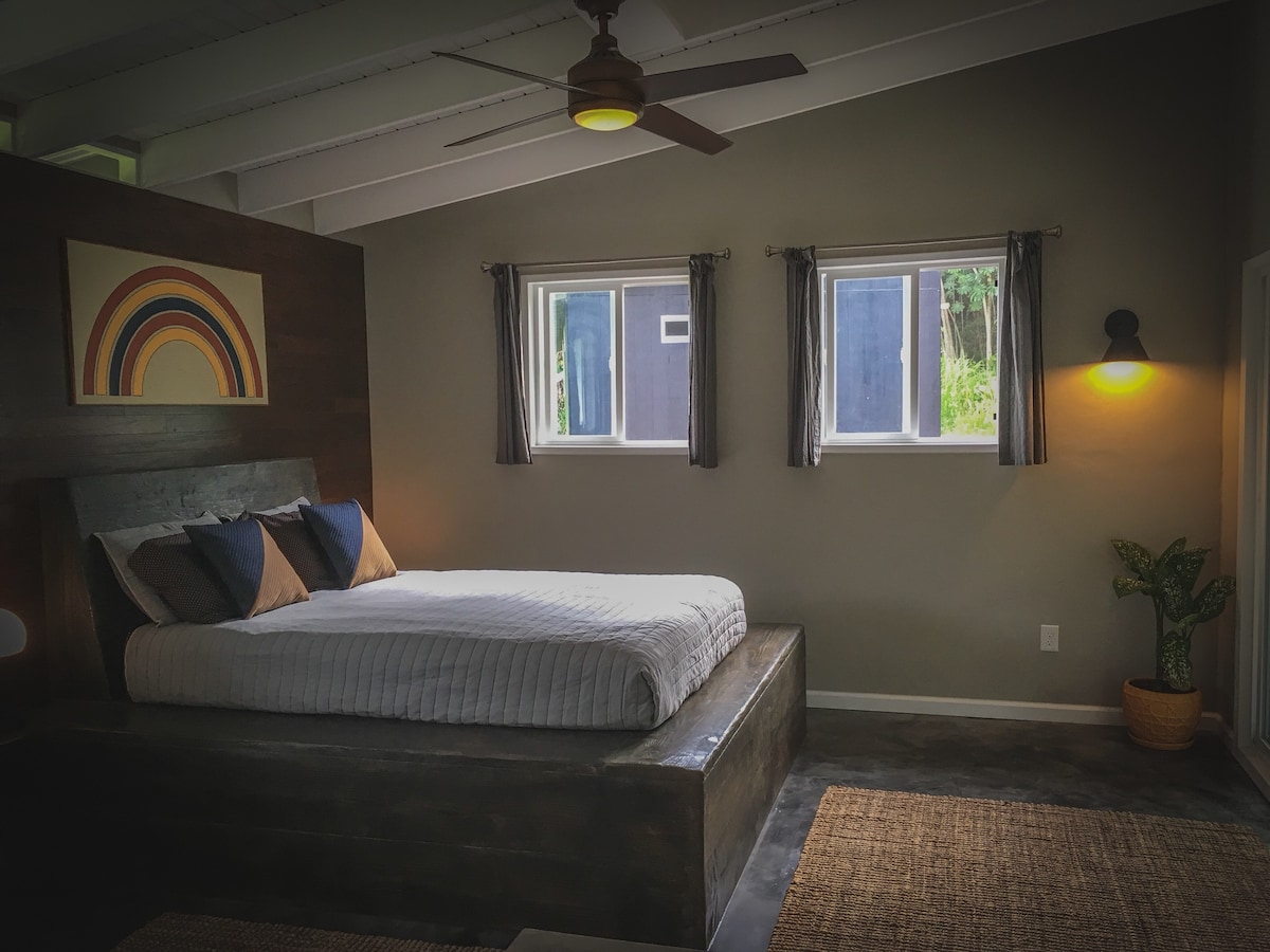 UBICADA en🌴 privado entre imponentes palmeras y vibrante follaje tropical, nuestra tranquila suite está encaramada en un santuario de selva tropical nativa de Ohi'a. EXPLORA playas de arena🌋 negra, selvas salvajes, estanques volcánicos calientes y el Parque Nacional de los Volcanes de Hawái. Disfruta del zen a 🎋 diario con la naturaleza: Cena y relájate en el salón con chimenea en medio de las vistas y los sonidos del bosque en el lanai protegido. REFRESCARSE: la selva tropical💦 prístina ofrece un equilibrio armonizador de sol y lluvia con temperaturas medias de elevación costera más frías de 83H-65L.