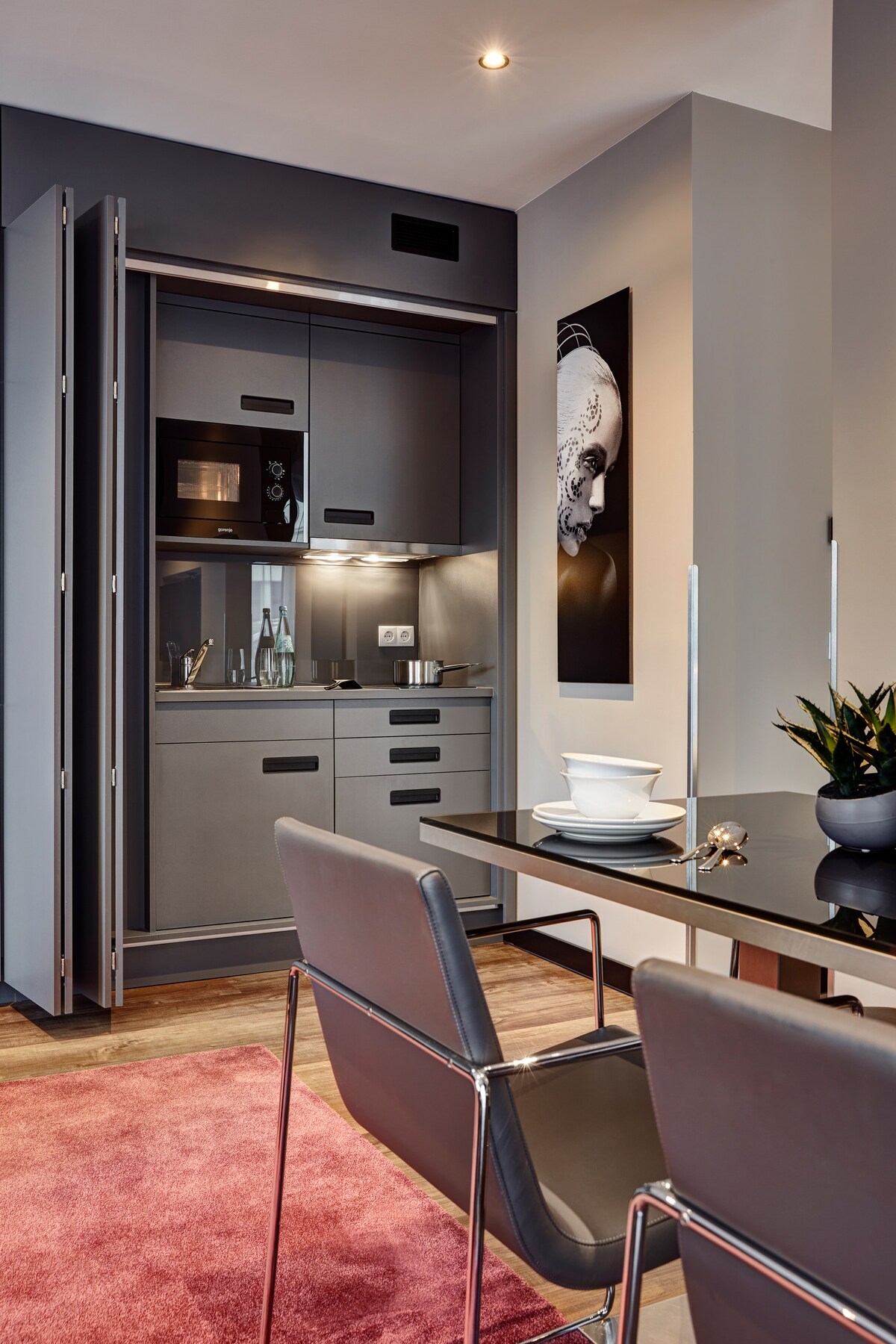 Nuestro apartamento de larga estancia ofrece un hogar temporal con todas las comodidades de un hotel. Tranquila ubicación en una calle lateral del anexo, pero cerca del centro de la ciudad · Zona de estar y dormitorio separada · Cama king size (1,80 m x 2,00 m) con cobertor y manta acolchada para colchonetas · Pared del gabinete con despensa, lavandería y compartimento para ropa · TV de pantalla plana con canales CELESTES e internacionales