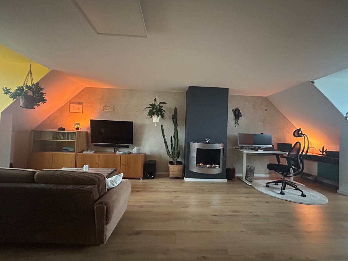Conmigo tienes mucho espacio para llegar: luminoso, moderno y acogedor, por encima de los tejados. Ideal para parejas, amigos, familias o trabajo a distancia. Una cama doble real en el dormitorio, además de dos habitaciones más con sofás que se convierten rápidamente en camas dobles, por lo que hay hasta 3 "dormitorios" con 6 plazas para dormir. Dos balcones para el vino y para relajarse. Aparcamiento en el patio (vale oro aquí), wifi rápido y un espacio de oficina en casa completo con base, 2 monitores y auriculares. Ven como eres
