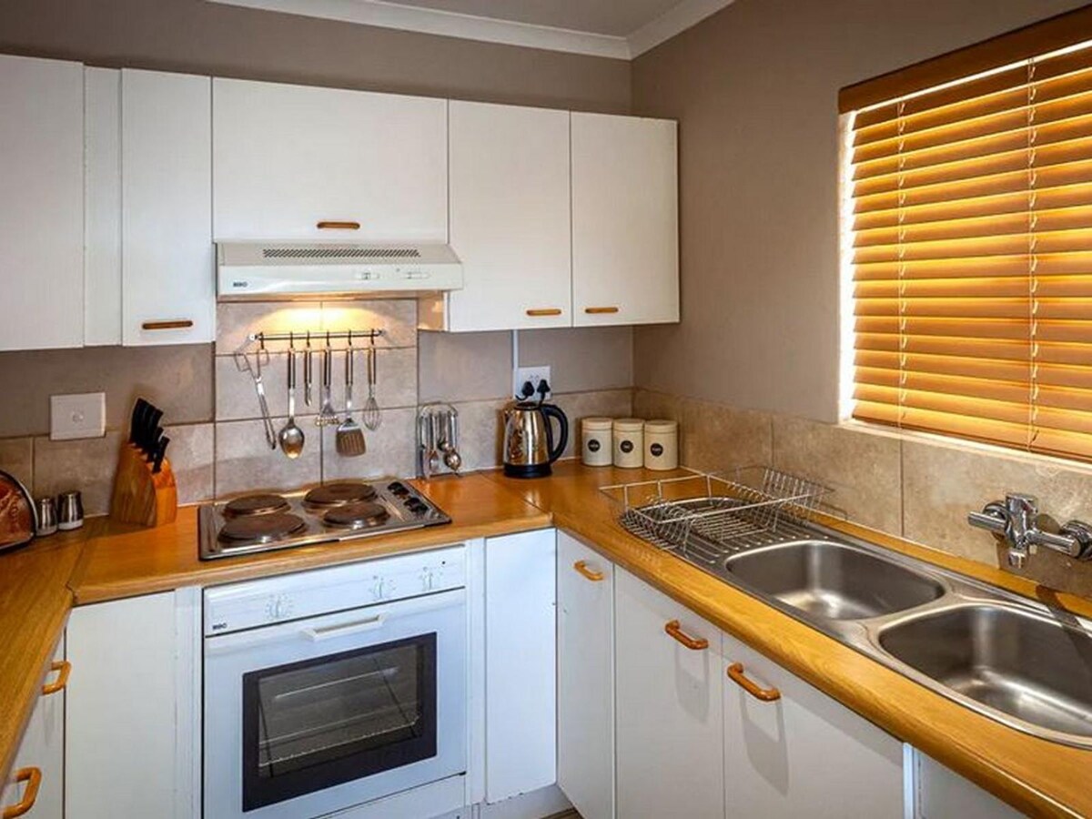La casa adosada tiene aire acondicionado y entrada privada. El dormitorio principal está amueblado con una cama de matrimonio y el segundo dormitorio tiene 2 camas individuales. El baño está equipado con ducha. La cocina de planta abierta está equipada con fogones con horno, microondas, nevera y barra de desayuno. Los huéspedes pueden relajarse en el salón, que cuenta con TV con paquete DSTV completo y se abre a una terraza con instalaciones para barbacoa. Servicio de lavandería disponible bajo petición. Aparcamiento seguro bajo techo disponible.