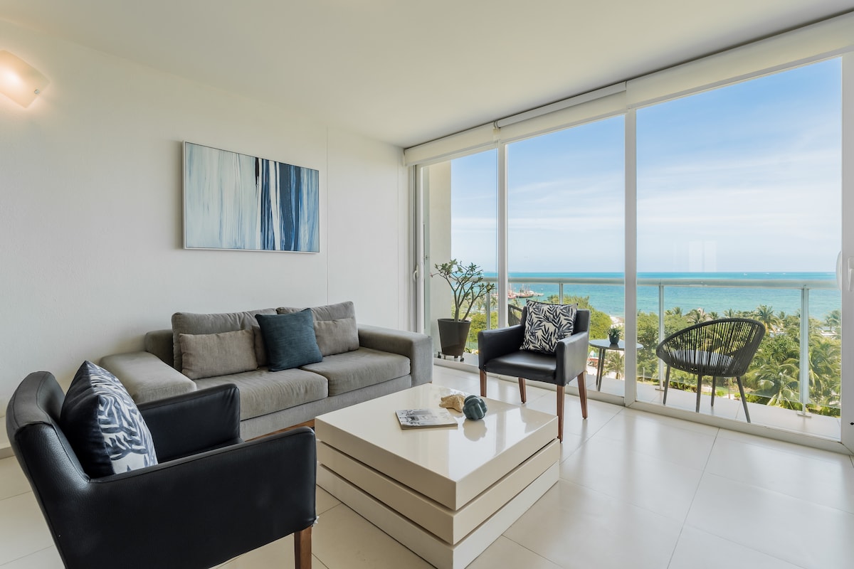 Modern Ocean View Apartment in the heart of the town. Everything you want in 5 min walking distance from the beach to the main plaza with its restaurantes, bars, and a supermarket. Enjoy the views of the crystal blue Caribbean Sea from your bed or private balcony. Swim in the rooftop pool, relax on the sun lounger or socialize at the common area. Visit the beautiful beach & enjoy a cozy apartment with all the amenities for your comfort like fully equipped kitchen, TV, and complimentary WI-FI.
