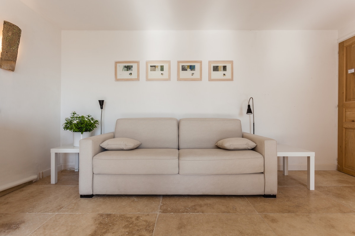 Dormitorio situado en nuestra casa, enclavado en las alturas de un pequeño pueblo provenzal en medio de un olivar con vistas panorámicas del macizo de Sainte Baume. Estarás tranquilo y podrás visitar los innumerables pueblos del Haut Var cerca de la casa. Tu habitación de 25 pies cuadrados tiene: - Acceso privado a una cama tamaño queen de 160x200cm - Cuarto de baño con ducha, bañera, inodoro y secador de pelo - Un espacio de trabajo funcional y práctico (mesa portátil) - Comedor - Cafetera y té Nespresso