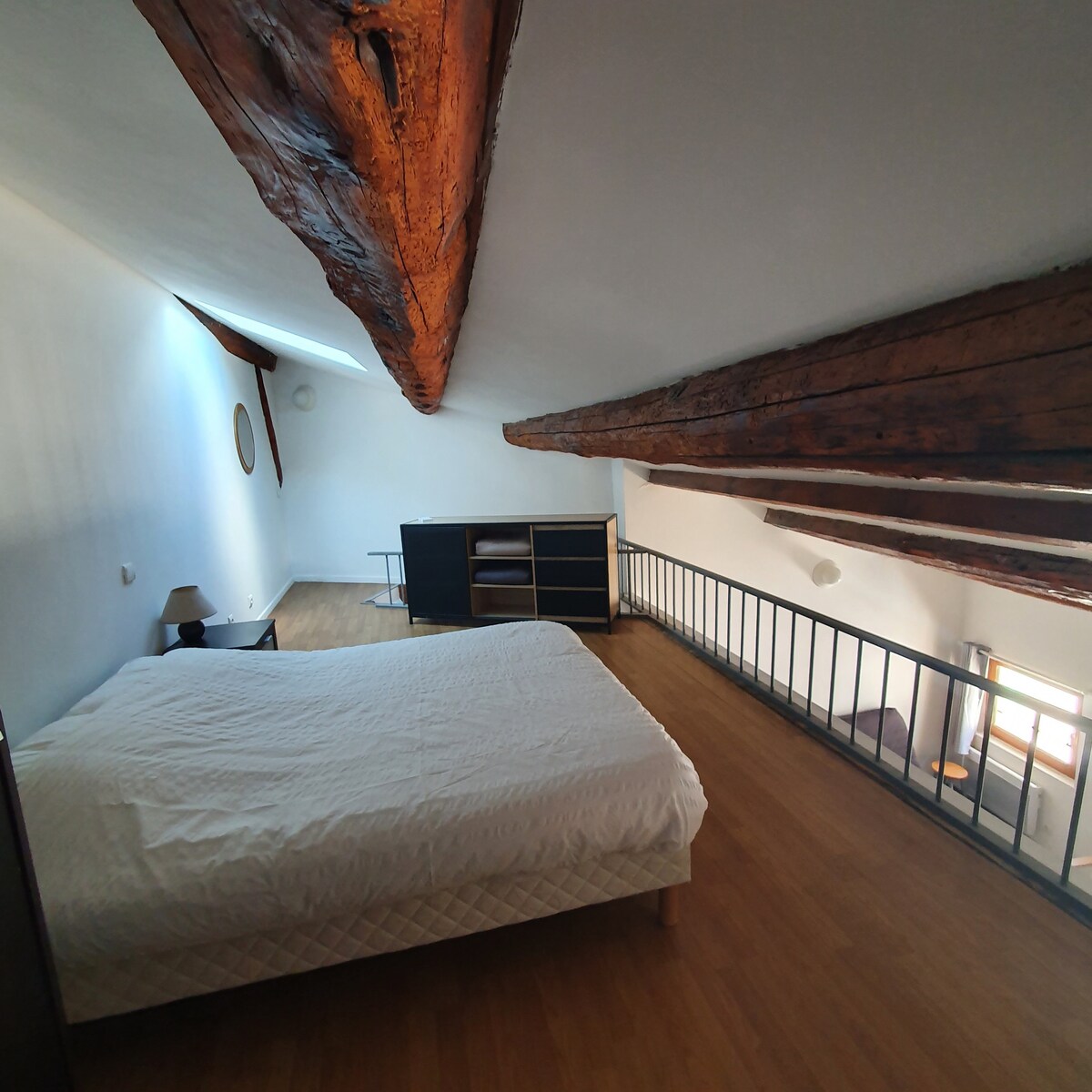 Dúplex con encanto, tranquilo y confortable situado en el corazón del casco antiguo en el barrio de los artistas justo al lado de Les Halles gourmandes (a 7 minutos a pie del Palacio de los Papas y del puente de Aviñón). El apartamento de 70 m2 con una altura de techo de 5 m está climatizado y tiene 2 dormitorios (1 cama de 140 y 2 camas de 90 que se pueden unir en una cama de 180). La gran sala de estar con su cocina abierta dispone de un sofá cama con somier y colchón (comodidad de una cama).