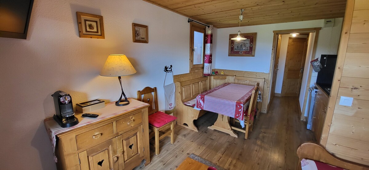 Acogedor y cálido estudio-cabaña de 20 m², situado junto a las pistas y en el corazón del pueblo de Les Saisies, que le ofrece el lujo de poder ir andando a todas partes. Durante tu estancia, disfrutarás de comodidad y sofisticación. Dispone de una pequeña terraza orientada al sur que permite disfrutar del exterior y ofrece vistas panorámicas a las montañas. En el corazón del Espace Diamant, entre los Aravis y el Beaufortain, en la ruta de los Grandes Alpes. INVIERNO 2027: NUEVO SOFÁ 160 x 190