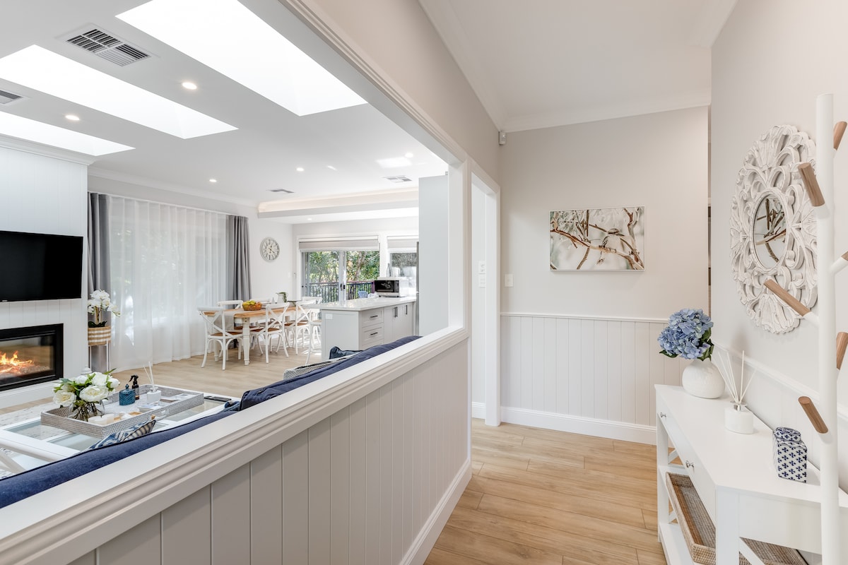 Escapada de lujo al estilo de los Hamptons en South Leura. Comodidad prémium con aire acondicionado por conductos, chimenea de gas, fogata iluminada con festones, luces de jardín y tragaluces que enmarcan las exuberantes vistas al bosque. Disfruta de vino y chocolates de bienvenida, sábanas de lujo y Netflix y Prime gratuitos. Tres elegantes dormitorios, cocina totalmente equipada, ideal para escapadas románticas, babymoons, fines de semana de chicas o escapadas familiares. Una tranquila casa de campo de alta gama lejos de casa.