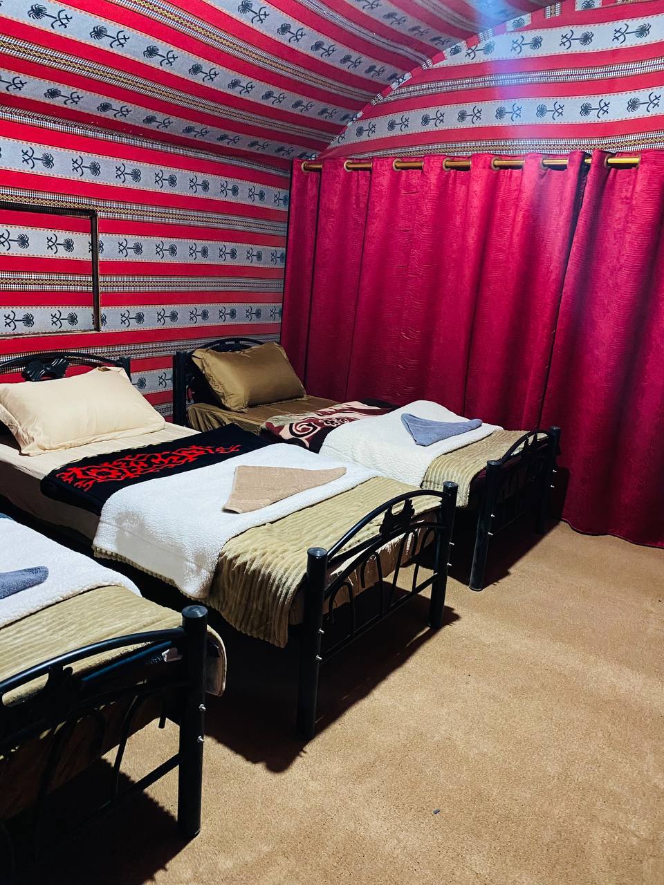 Pasa una noche en una tienda beduina de lujo en el corazón del desierto de Wadi Rum Esta tienda de lujo consta de 3 camas individuales en una habitación privada con baño y una ventana panorámica que conduce a la terraza privada con una vista increíble del desierto. Se te proporcionarán toallas, champú y agua gratis. Incluye cena y desayuno beduinos tradicionales gratuitos en la sala común. El traslado desde el pueblo cuesta 10 JD por persona si no reservas un tour con nosotros.