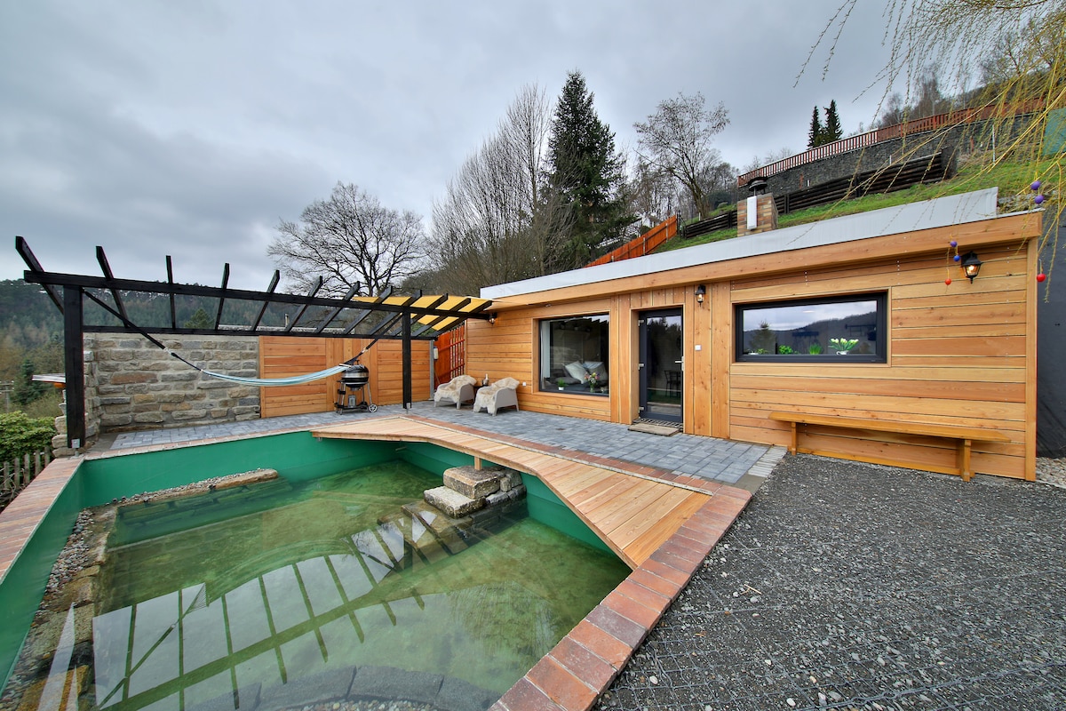 La cabaña es adecuada para un máximo de 5 + 2 personas (5 adultos + 2 niños) La cabaña Fraluq se encuentra en el hermoso paisaje del Paraíso Checo. Está inspirada en Escandinavia y trata de conectar el interior con la naturaleza circundante. Está equipada para que se sienta cómodo y no le falte nada. La amplia terraza le encantará por su ambiente romántico. Aquí encontrará un jacuzzi y una agradable sala de estar donde podrá disfrutar del desayuno y del café de la mañana. La terraza está orientada al sur, por lo que podrá disfrutar del sol durante todo el día.