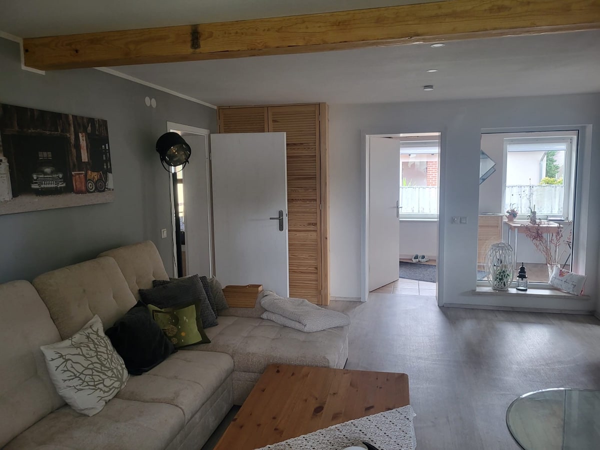Te ofrecemos nuestro apartamento individual con entrada independiente como alojamiento de vacaciones. El apartamento está diseñado para 2 personas y 1 máximo 2 niños y tiene una habitación con una gran cama de somier, un sofá plegable (como una cama supletoria ), una cocina totalmente equipada y un baño moderno. No dudes en traer a tus mascotas. La propiedad está completamente vallada e iluminada por detectores de movimiento.