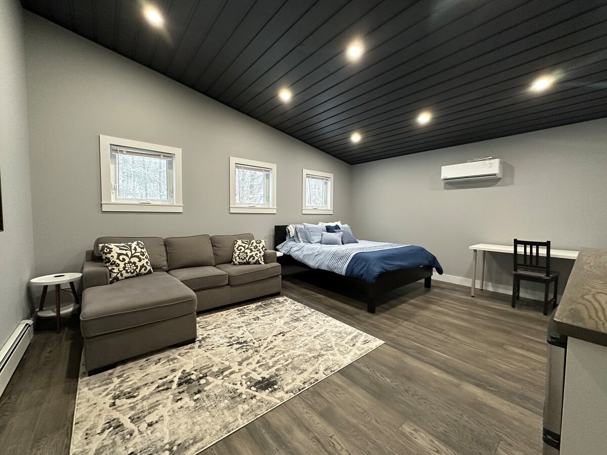 Suite de invitados en el segundo piso ubicada a solo 5 minutos del centro de Bancroft. Esta gran suite tiene una cama tamaño queen, un sofá cama tamaño queen, una mininevera con congelador, un microondas, un televisor inteligente, una máquina Keurig (té, café, edulcorantes y leche/crema incluidos) y un espacioso baño con ducha a ras de suelo. Ten en cuenta que hay que subir un tramo completo de escaleras para acceder a esta unidad una vez dentro de la puerta. Ten en cuenta que no hay cocina en esta suite, los aparatos de cocina y las velas están prohibidos debido al riesgo de incendio.