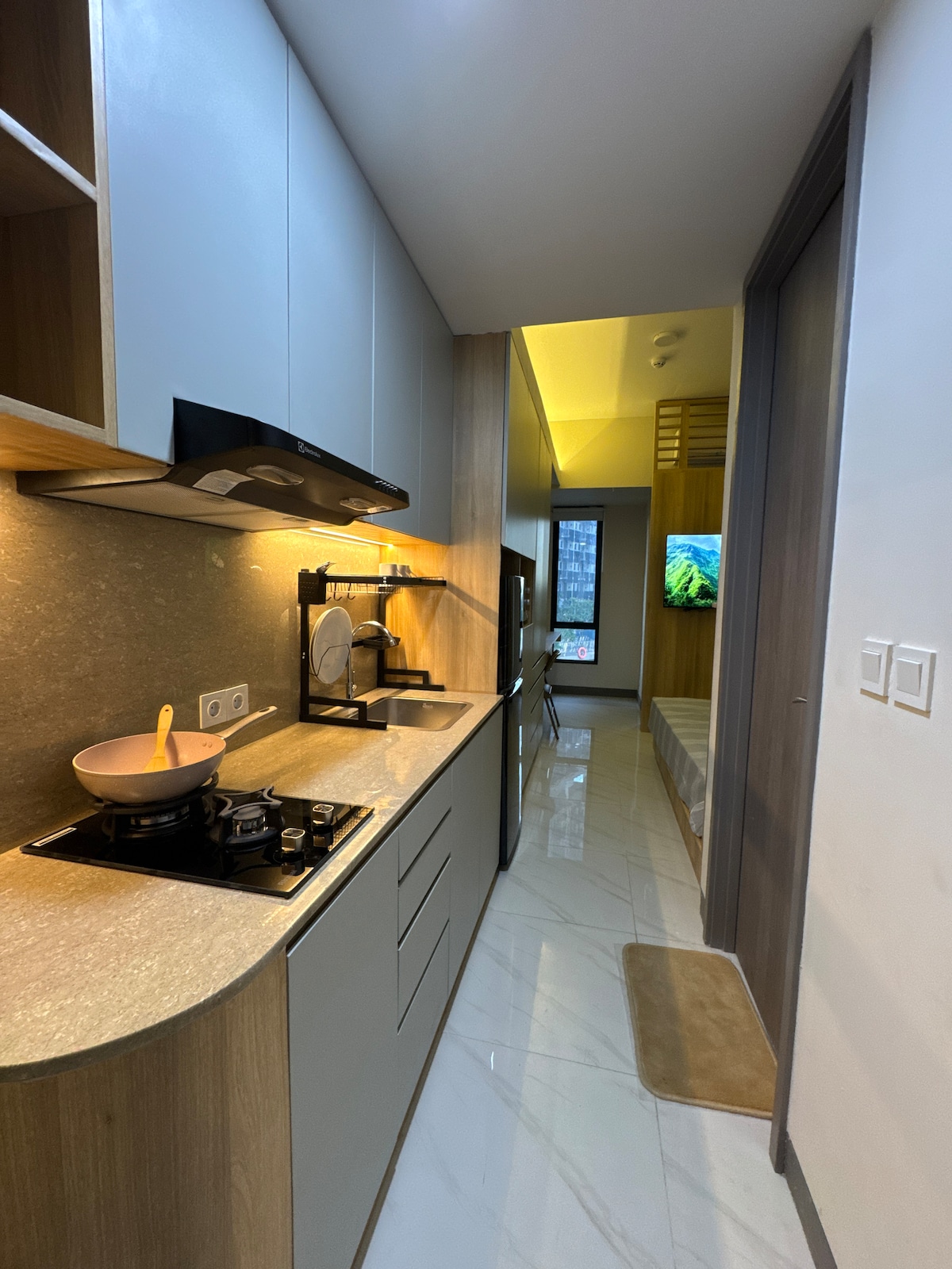Bienvenido a la habitación Giefanni. ^^ Este es el lugar perfecto para tu estancia en la zona de Bekasi, con un estilo bohemio moderno y una vista increíble tanto del amanecer como de las luces de la ciudad por la noche. El edificio está directamente integrado con el centro comercial Lagoon Avenue, donde puedes comprar o cenar en varios locales como KFC, Imperial Kitchen, Solaria, Burger King, Kiddie Crab, Alula Coffee, White Forest, CGV y muchos más.
