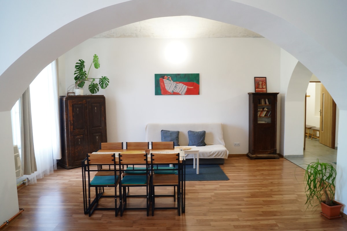 El apartamento completamente recién reformado se encuentra en una histórica casa gótica protegida del siglo XIV en el centro histórico de Litoměřice. La individualidad del apartamento está subrayada por las bóvedas originales y el interior de diseño. Cerca encontrarás restaurantes, cafeterías y una tienda de comestibles (30 m). El coche se puede aparcar en un aparcamiento de pago justo al lado del apartamento, recomendamos una estancia más larga en la estación de autobús y tren (500 m) por 10 CZK por día.