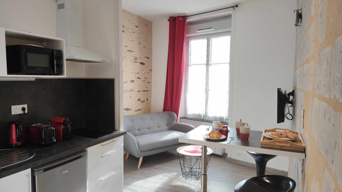 Appartement traversant avec une chambre séparé calme coté cour de 28m2 calme refait à neuf, charmant mur en pierre apparent dans une copropriété calme, au 2er étage, . Une décoration soignée made in Angers. Une entrée sécurisée à badge, partie commune sous vidéo surveillance.