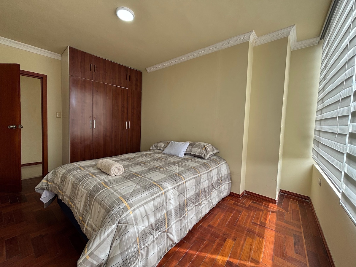 Está ubicado en un lugar estratégico cerca de restaurantes ,iglesias , instituciones,gimnasios,farmacia cajeros ,automáticos bares y supermercado. Puedes llegar caminando. otra de las caracteristicas de éste hospedaje es que es muy elegante y comodo ,tiene 2 camas una full y una queen y un sofa cama , espacio hasta 5 personas. Tiene espacio para un vehiculo