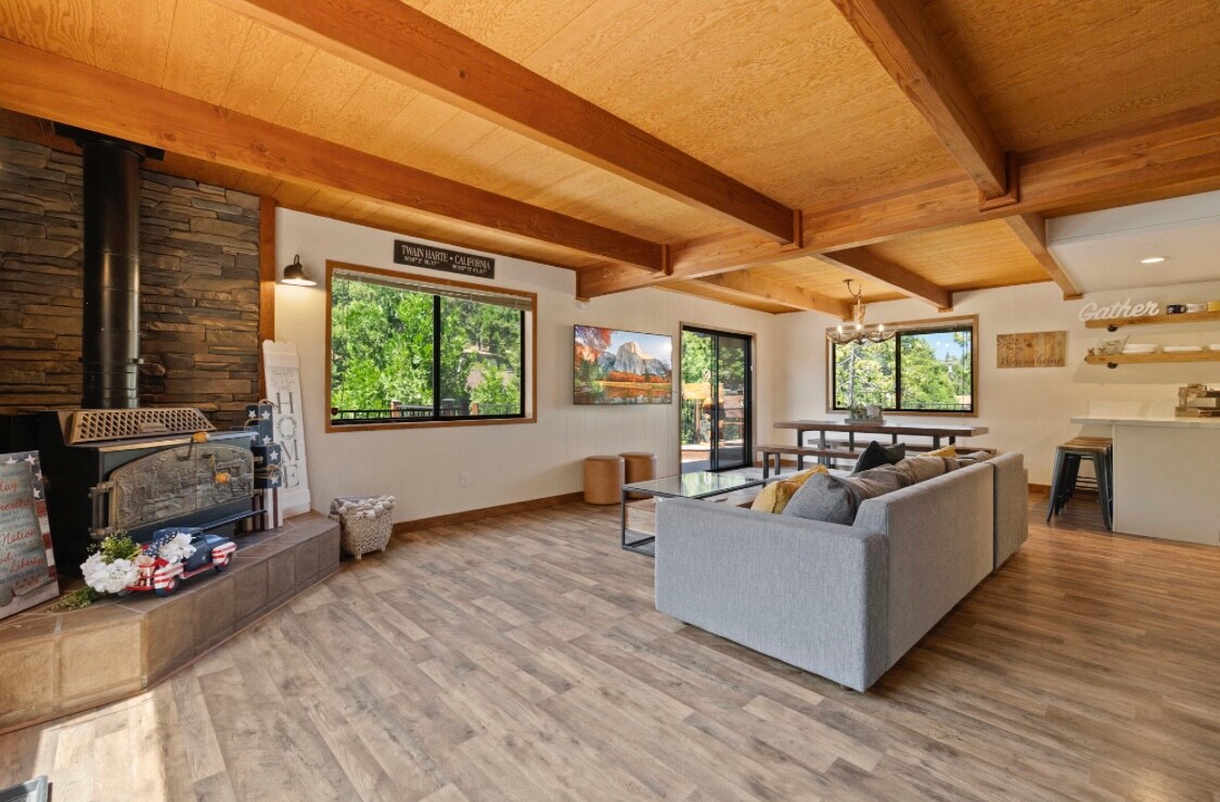 Our Cabin is a perfect mountain get away. Whether you're visiting nearby Twain Harte Lake, Pinecrest, Yosemite or just wanting to relax & enjoy sitting on the back deck with a glass of wine; You'll find our home a very relaxing and quiet stay with a short 4 min walk to town! In the winters enjoy a wood burning fire place and watch the snow fall in the big picturesque front windows & tall open beamed ceiling. Firewood not included. Located in a quiet neighborhood to decompress from the hustle
