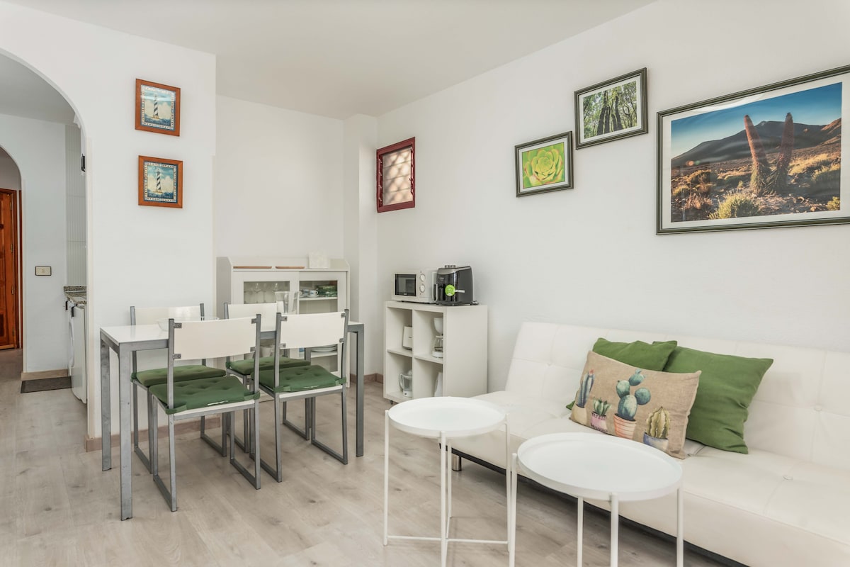 Ask me for special price! Cozy flat with pool view. Located just 3 minutes from the sea. Close to Las Vistas and Los Tarajales beaches. It has a big swimming pool with free sun lounge. Supermarket open daily and pharmacy 50 mtrs. Only 10 minutes from bus stop and 15 km from Tenerife Sur airport. The flat has a living room, equipped kitchen, bathroom, washing machine, bedroom, terrace and Wi-Fi. Nice for two people traveling alone.