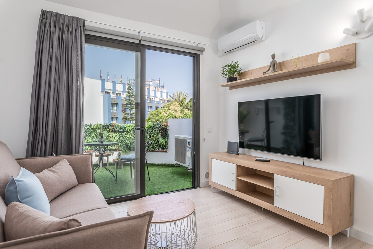 This charming modern apartment is carefully renovated to offer the best leisure and relaxation. It features a fully equipped open plan kitchen with a spacious bright dining and living room, which leads onto the large terrace with pool and garden view. The apartment has one comfortable bedroom with build-in wardrobe and a modern bathroom with shower. The complex offers a community pool exclusive for residents and a variety of excellent restaurants. The beach is only a 10 min easy walk.