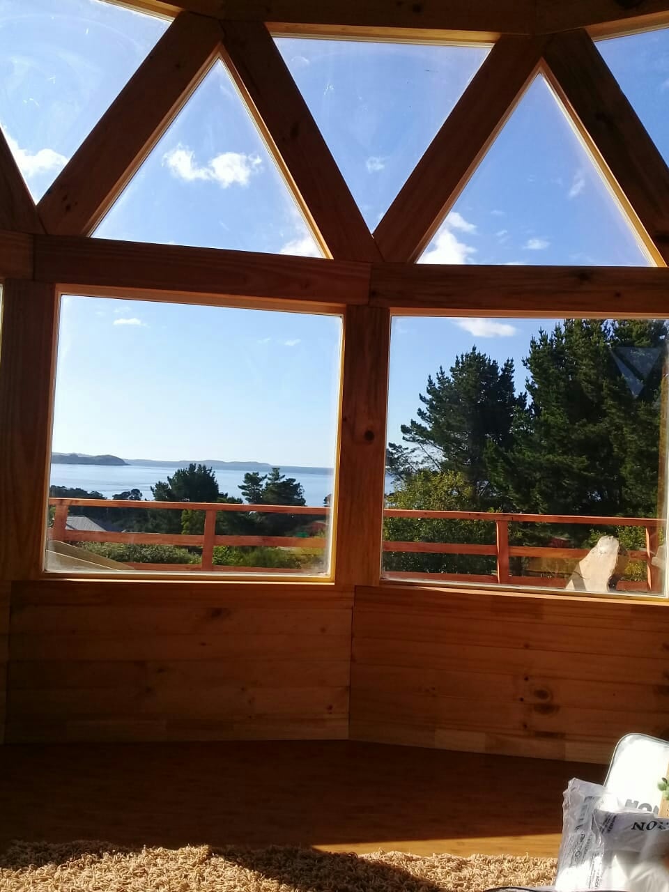Es un domo construido con maderas nativas (alerce, mañio, cipres). Esta ubicado en la entrada norte de la ciudad sector TenTen costero a solo 5 min desde el centro y a 15 min. del aeropuerto, con vista privilegiada hacia los palafitos y mar interior.