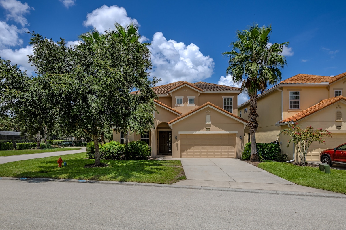 ¡Escápate a tu lujosa villa mediterránea! Perfecto para más de 10 huéspedes, cargador de vehículos eléctricos de nivel 2 con carga gratuita fuera de las horas punta, apto para mascotas y niños, 6 dormitorios, 4,5 baños, ofrece el máximo confort. Disfruta de una piscina privada climatizada, sala de juegos y televisores en los dormitorios. Ubicado en un centro vacacional cerrado seguro, disfruta de la piscina y el spa del centro vacacional, el gimnasio y el parque infantil. Nuestra villa también cuenta con una parrilla de barbacoa de gas y comodidades para bebés. Ideal para familias o viajeros de negocios. Cerca de todos los principales parques temáticos. ¡Reserva una escapada inolvidable hoy mismo!