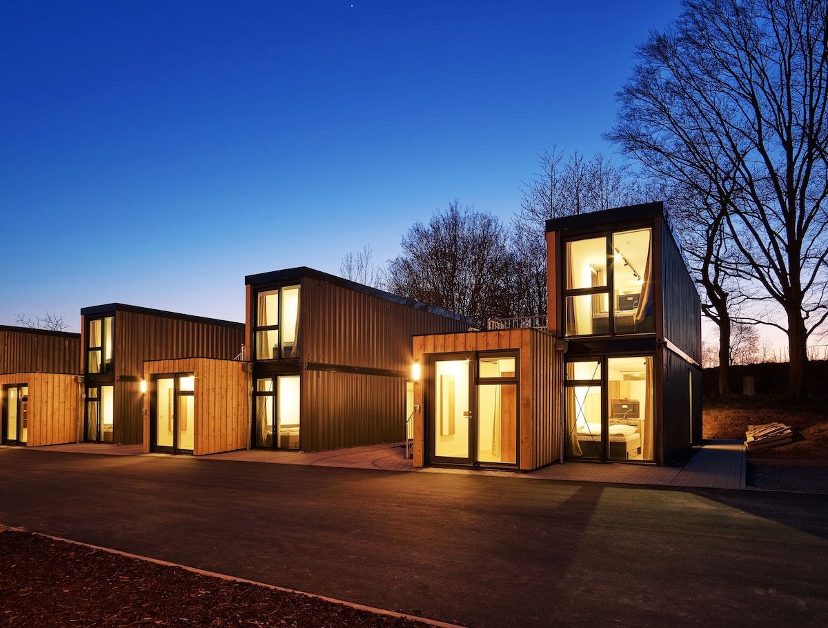 La moderna unidad residencial consiste en reciclar contenedores en el extranjero. Los contenedores de carga en desuso han encontrado un nuevo hogar con nosotros - un puerto seguro en Wertheim. Desde la idea creativa del upcycling, no solo nuestro entorno se beneficia, sino también tú. La casa diminuta de 26m² ofrece todo lo que esperarías de una microcasa moderna. Una pequeña cocina, una terraza privada, un aparcamiento iluminado justo fuera de la puerta principal y la buena sensación de vivir en su propia casa.