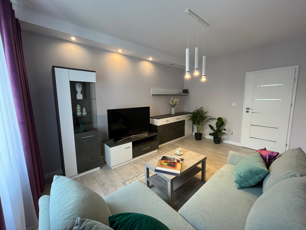 Un apartamento íntimo en la planta baja del edificio, cerca del centro de la ciudad. Un salón conectado a la cocina y 2 dormitorios con camas grandes. Gracias al sofá cama del salón, con capacidad para 2 personas, y a un sillón individual, el apartamento tiene capacidad para un total de 7 personas, y se puede añadir una cuna de viaje para un niño. Una gran terraza con vistas a Jasna Góra. Televisión con acceso a Netflix, wifi. Jasna Góra -950 m, City Park - 600 m , restaurantes - 400 m, tienda - 130 m. Plazas de aparcamiento gratuitas a lo largo de la calle.