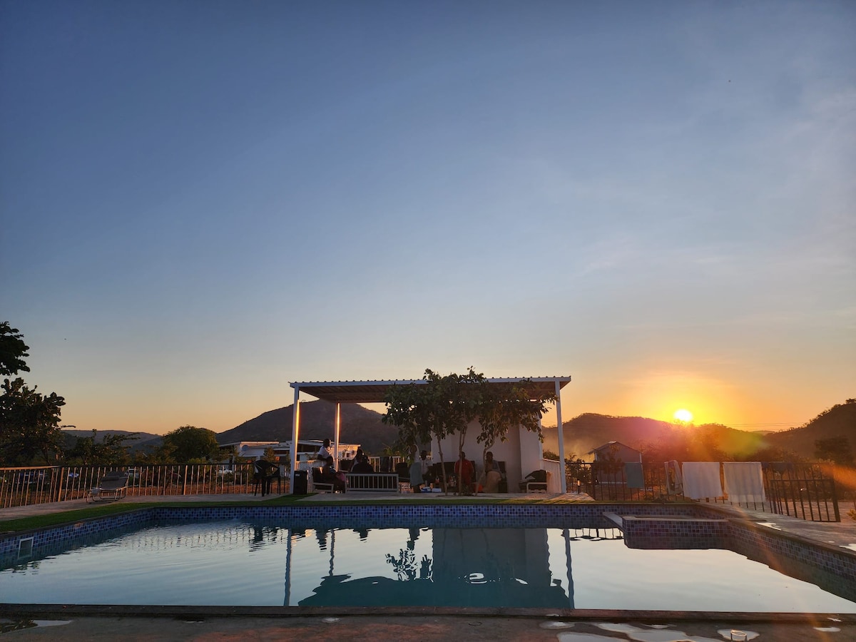Casa céntrica, pero tranquila, serena y espaciosa con jardines maduros y exuberantes. Disfruta de la hermosa piscina privada, relájate en el cenador, escucha a los pájaros y observa las estrellas por la noche junto al fogón en las noches frescas. La casa cuenta con personal diurno que puede ayudarte a cocinar tus comidas, lavar la ropa y garantizar que disfrutes de una estancia cómoda, energía solar las 24 horas, los 7 días de la semana, para todos los elementos esenciales, wifi Starlink, sistemas de seguridad de alta gama y su propio pozo privado. Accesible desde Twin Palm o Great East Road. Cerca del aeropuerto.