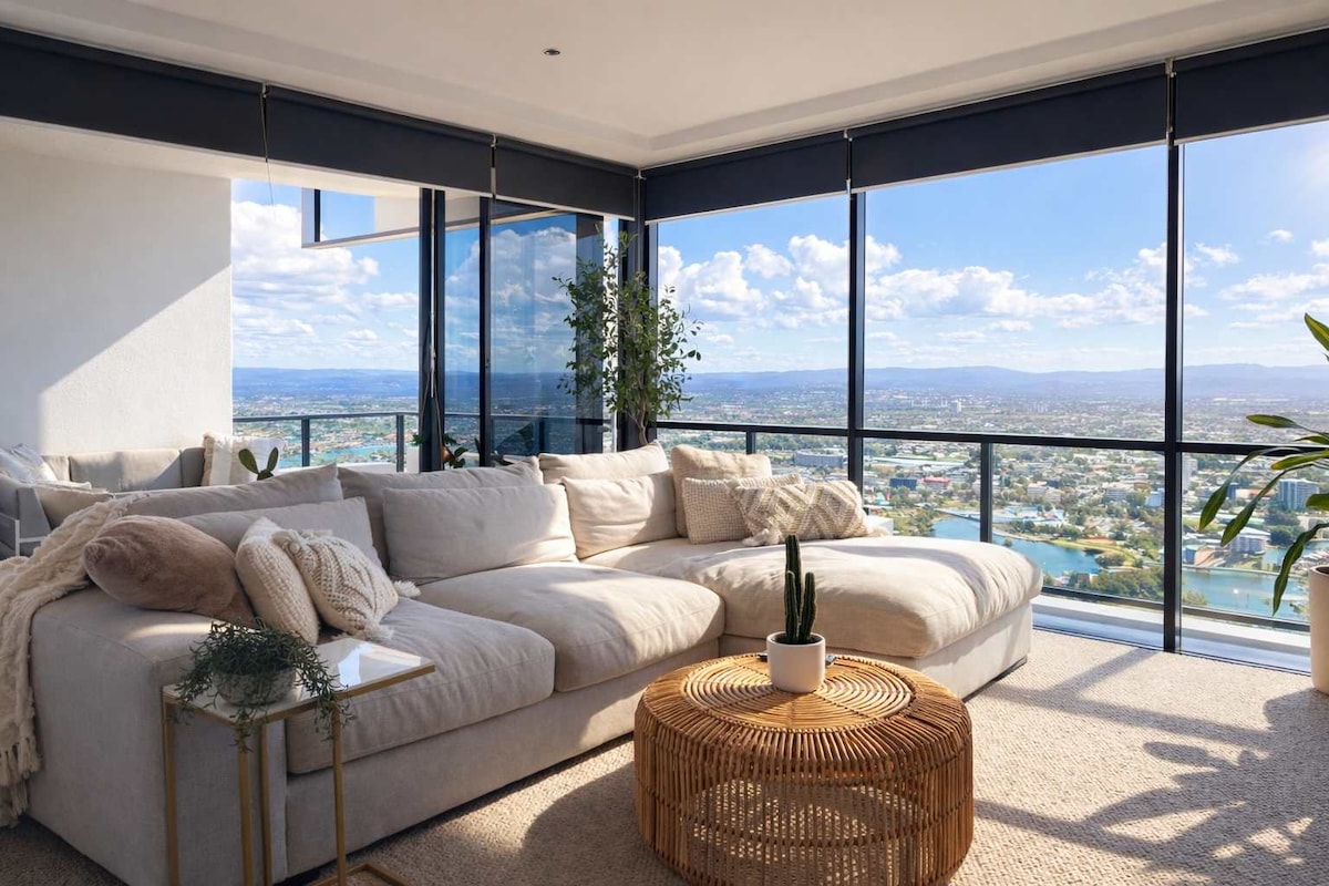 Disfruta de una estancia de lujo en nuestro impresionante apartamento Circle On Cavil. Ubicado en el nivel 41 con increíbles vistas de 180 grados al océano y al interior. Con una ubicación céntrica a todas las tiendas, playas y la avenida Cavil. Relájate y disfruta de las mejores vistas en tu propio balcón privado. Cocina completa, baño de hidromasaje de lujo, sala de estar equipada con muebles King. Ambos dormitorios están equipados con colchones de calidad con la parte superior acolchada. A un paseo de la playa. No necesitas coche: coge un tranvía a Broadbeach o un autobús a todos los parques temáticos.