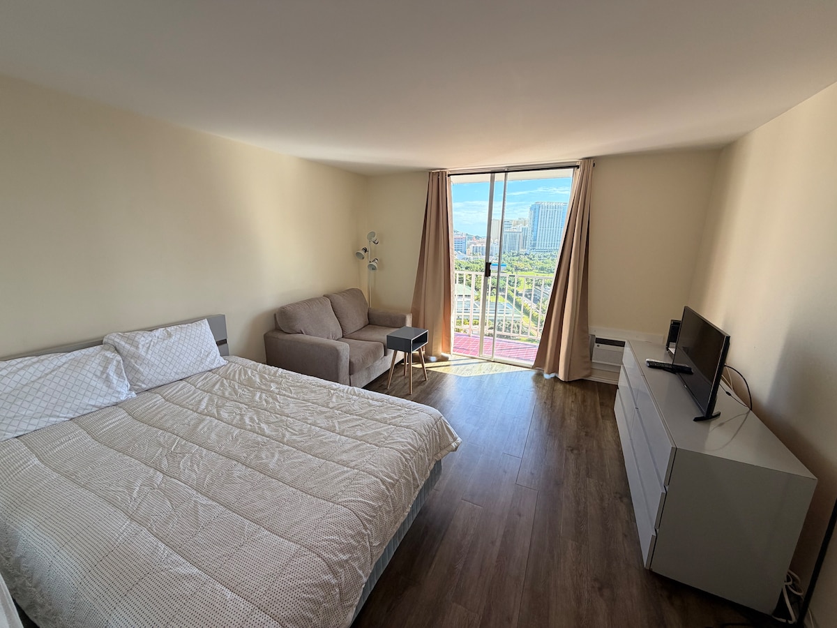 Sweeping ocean and coastal view! Convenient studio at the entry of Waikiki. Short walks to world famous Waikiki beaches and lagoons; Hilton Hawaiian Village where fireworks lit up every Friday night; world's largest open-air mall: Ala Moana shopping center with free daily live Hawaiian music and shows; Hawaii Convention Center; and many restaurants and activities. Kitchen with quartz counter, safe and fast induction cook top. Comfortable King size bed, desk, free assigned parking.