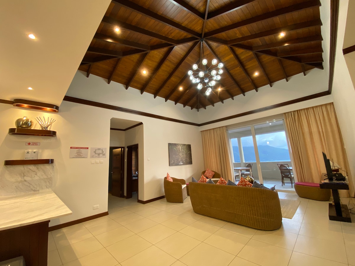 Habitación con 1 cama tamaño queen y balcón en el piso superior, tiene baño privado, minibar , wifi es de cortesía y aire acondicionado también una televisión en el interior , Se proporciona desayuno previa solicitud y son 250 rupias por persona. El servicio de lavandería está bajo petición y son 15 rupias por artículo El impuesto se cobra a la llegada en efectivo solo 25 scr por persona y día