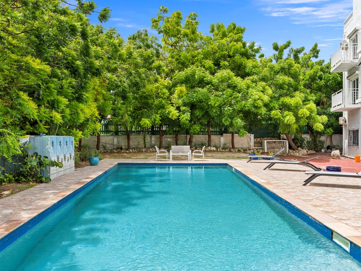 ¡Este encantador, acogedor y tranquilo nido tropical se encuentra donde se encuentra toda la acción! El campo de golf, los bares emblemáticos, la pista de aterrizaje sin precedentes, las populares playas de Maho y Mullet Bay, el mercado de Maho con bufés de desayuno/almuerzo para llevar frescos todos los días y una selección divina de restaurantes exóticos están a poca distancia a pie. Si solo deseas descansar y relajarte junto a la piscina, el jacuzzi y el bar privado del cenador o disfrutar de la vida nocturna, todo está disponible para que te lo disfrutes.