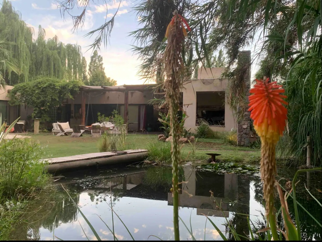 Casa en la laguna es una casa de diseño único. Esta ubicada sobre una laguna con plantas acuáticas y rodeada de árboles añosos. Posee vistas al jardín compartido adonde viven 2 perros, y un caballo Pony rescatado que te cautivará con su sola presencia. Esta equipada con finas terminaciones: losa radiante, cama king, baño en suite, hidromasajes para 2 personas, frigobar, cocina completa y un entorno natural único que te permitirá descansar rodeado de naturaleza.