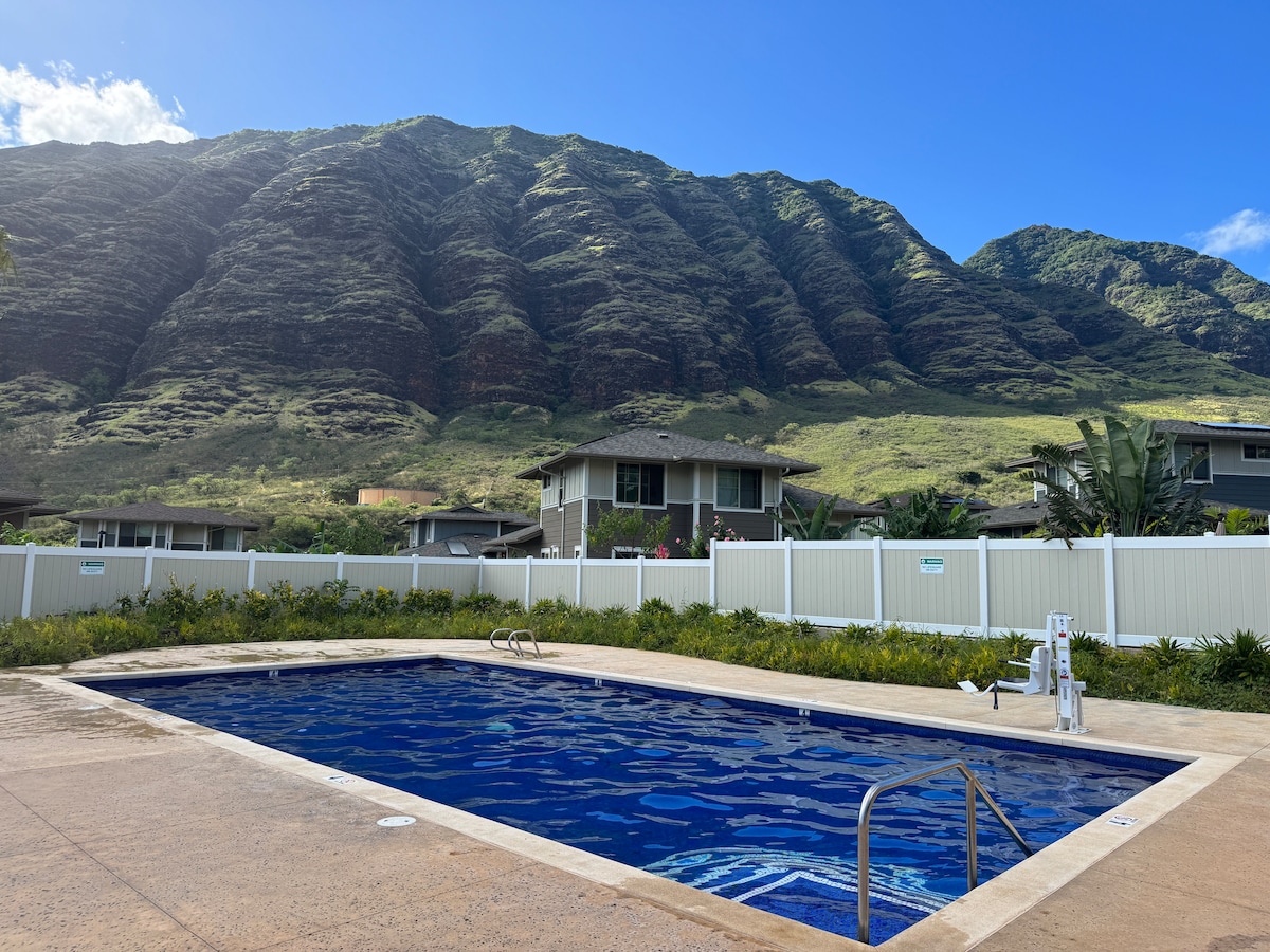 ❀ E komo mai ❀ Imagina pasar las vacaciones en una casa a estrenar ubicada en un valle tranquilo. Estás rodeado de las montañas Ka'ala y Waianae, palmeras imponentes, árboles de mango, pavos reales salvajes y playas famosas. Da un paseo al amanecer/atardecer por el barrio cerrado (con seguridad las 24 horas) y regresa a casa para disfrutar de una cena tranquila. ¿Te hospedas en invierno? Observa ballenas y delfines en la costa y contempla cascadas en las montañas circundantes. Durante todo el año se puede practicar surf, esnórquel, avistamiento de tortugas, ver arcoíris y hacer senderismo en las inmediaciones.