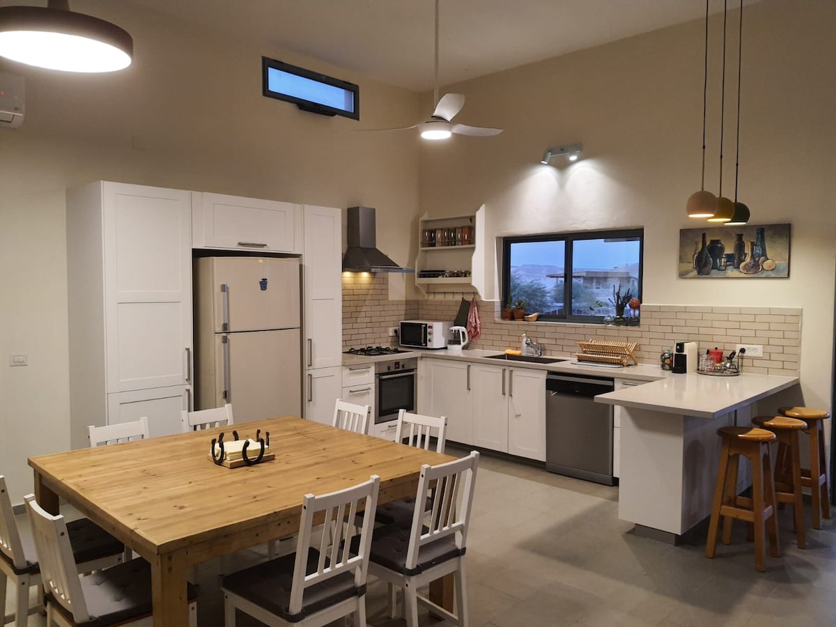 Una villa colorida, cálida, espaciosa y luminosa. Ideal para una gran familia con niños. Un gran cristal y climatizado en un patio vallado, un precioso manantial a 5 minutos a pie. La cocina kosher, la sinagoga y mikveh están cerca (se encuentran en una comunidad religiosa,aparcando en Shabat solo en la puerta). Amplio y cómodo salón y cocina, enorme biblioteca, Xbox, 2 baños de mimos. Amplio principal y cuatro dormitorios. En el exterior hay una instalación de escalada para niños y un hermoso jardín, y un parque infantil muy cerca. Se pueden alquilar inflables acuáticos en el jardín de la villa. Gran lugar para hacer senderismo por los alrededores o relajarse después de un viaje. ¡Te invitamos a experimentar la magia del desierto!