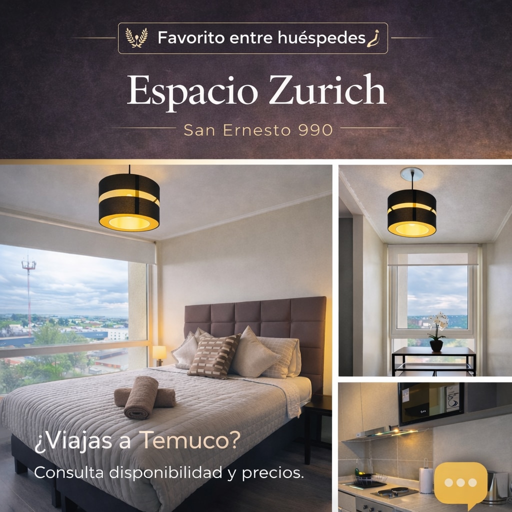 Disfruta de la comodidad y tranquilidad en nuestro moderno departamento, con estacionamiento y detalles pensados en tu estadía, conserjería 24 horas, ubicado en el prestigioso Edificio Espacio Zúrich, a pasos de Strip Center, supermercados, farmacias y una variada gama de restaurantes, además de su cercanía a la Clínica Alemana y el Mall Portal Temuco, con la mejor conectividad en un barrio que cuenta con todo lo que necesitas, es la elección ideal para quienes buscan ubicación y conveniencia.