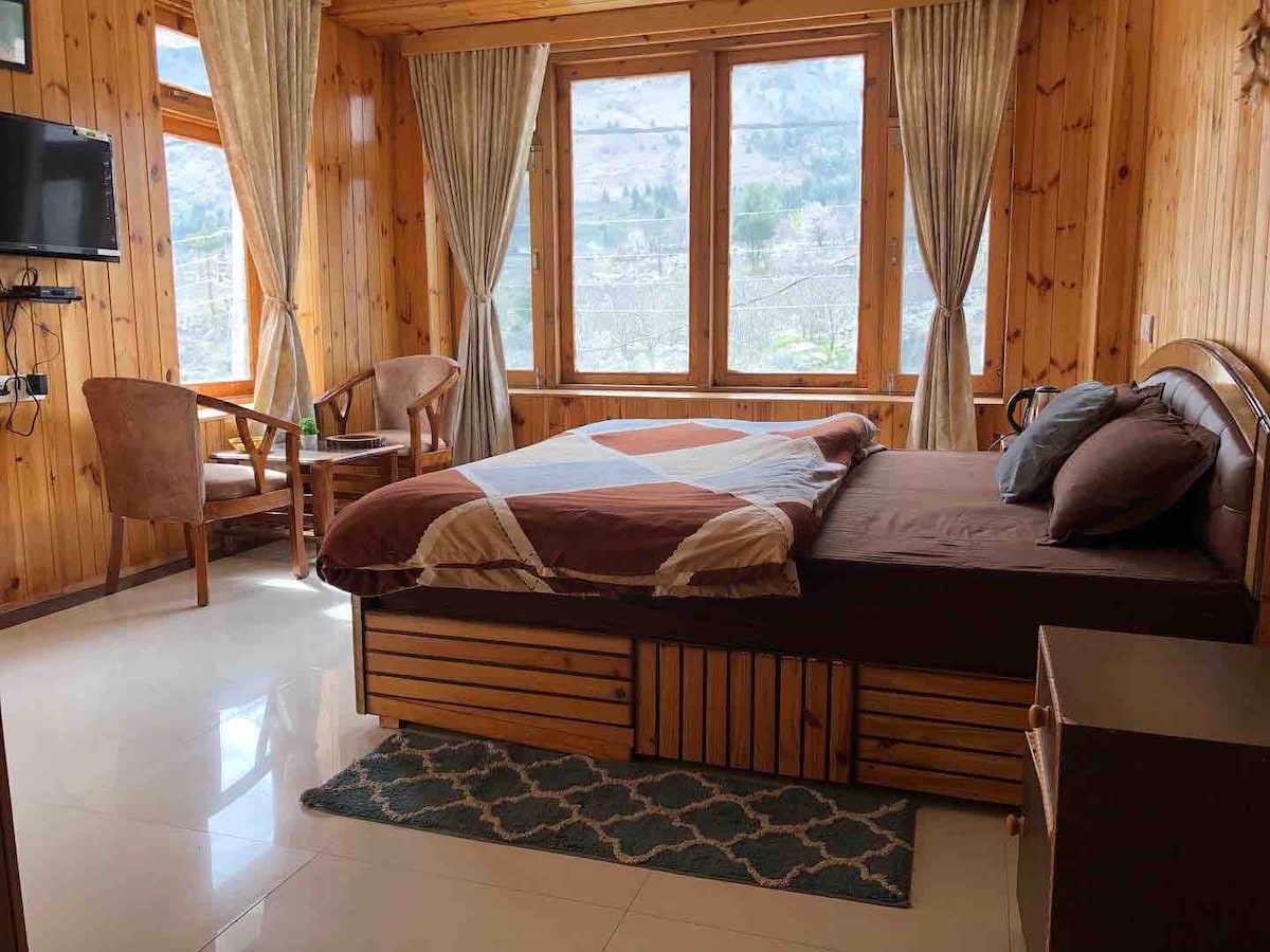 Rumsu Sunrise es nuestra mejor habitación doble. En el segundo piso de la propiedad, cuenta con magníficas vistas al valle y a los huertos de manzanas circundantes. Cuenta con un baño adjunto con agua corriente fría y caliente.